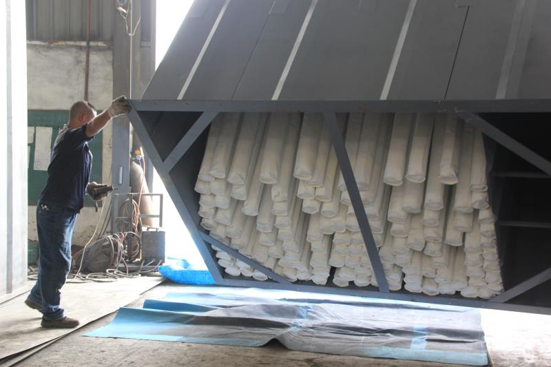 The PPC Series Airbox Pulse Baghouse Dust Collector, a widely used high-efficiency dust removal system in the industrial sector, is currently in the final assembly stage. Its core structure consists of a steel airbox housing and multiple sets of filter bags (visible as the white components in the images), making it a key solution for industrial dust control.